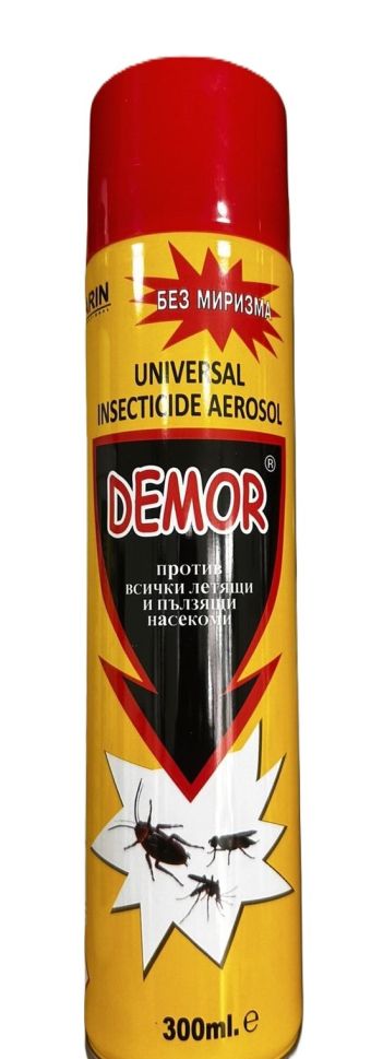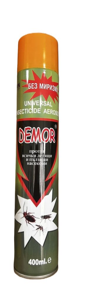 Универсален инсектициден аерозол без миризма. Спрей Демор е предназначен за борба с летящи и пълзящи насекоми в битови помещения. За унищожаване на хлебарки, бълхи, мравки, мухи, комари, молци, оси, мушици и други насекоми. Приложим както за професионална употреба, така и в жилищни помещения. Ползвайте срещу насекоми в търговски и индустриални обекти. Лесен за употреба флакон.